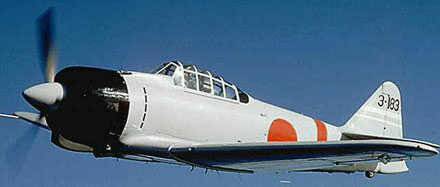 | Topo: Le chasseur-bombardier A6M, surnommé Zéro, fut adopté par l'aéronavale japonaise en 1940. Conçu par Jiro Horikoshi, il représentait la synthèse de la technique japonaise en construction aéronautique. Il avait un fuselage court, de larges ailes épaisses, et de bons ailerons. La base de sa structure ailaire ainsi que son train d'atterrissage étaient renforcés pour un usage sur porte-avions, mais le reste de l'appareil demeurait fragile. Le A6M était très bien armé, et fut le chasseur le plus maniable des belligérants jusqu'en 1942. Cependant, sa structure fragile n'était pas protégée par des plaques renforcées, tout comme ses réservoirs d'essence. Son moteur radial avait tendance à perdre de l'huile. Il fut l'appareil militaire japonais le plus produit durant la guerre. Pour les Américains imbus de l'infériorité japonaise, le A6M Zéro fut un choc. Bien que le A6M Zero vola durant toute la guerre, y compris comme appareil kamikaze, il a été progressivement éclipsé par le Ki-84 Hayate. | |||