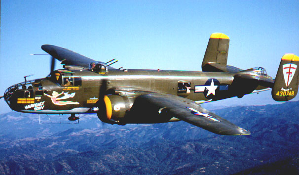 | Topo: Le B-25, surnommé Mitchell, devint le bombardier bimoteur tactique américain le plus apprécié et réputé de la Seconde Guerre mondiale. Il remplissait la même niche que le Ju-88 allemand ainsi que les Mosquitos et Beaufighters britanniques: un appareil de frappe polyvalent. Il fut le premier contrat militaire lucratif de la firme North American Aviation. Il remplaca rapidement les A-20 et A-29 dans le rôle de patrouille/attaque, et profita des difficultés du B-26 Marauder pour s'imposer comme bimoteur tactique standard. Bien construit, solide, fiable et ergonomique, il était bien apprécié de ses équipages. Ils furent présents sur tous les théâtres d'opérations alliés: de la Chine jusqu'aux ponts sur le Rhin. Plusieurs variantes ont été produites, dont une pour la reconnaissance photographique et une autre pour la frappe navale avancée, munie d'un canon de 75mm. Ce bombardier bimoteur se fit connaitre du public par sa participation au raid Doolittle sur le Japon en Avril 1942. | |||