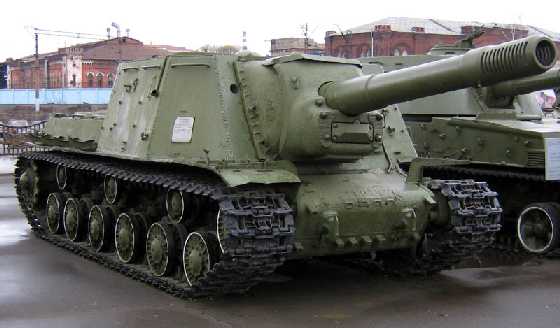 | Topo: Le char Klementi Vorochilov, nommé en l'honneur du ministre de la défense soviétique avant la guerre, est un char soviétique au blindage épais. Sa genèse commença en 1938 lors d'une visite par des étudiants ingénieurs au bureau SKB-2 de l’usine de chars Kirov à Leningrad. Le KV-1 a des chenilles larges lui permettant de bien tenir le terrain et de progresser sur les surfaces boueuses et neigeuses. Il a été une désagréable surprise pour les Allemands en 1941, car aucun char ne pouvait le détruire, sauf le canon antichar Flak-18 de 88mm. Une version a grande tourelle munie d'un obusier court de 152mm apparut en 1942 et appelée KV-2. En 1942, le KV-1 fut allégé pour améliorer sa mobilité. Les usines de l'Oural produisent une version appelée KV-1S, (s pour " skorostnoy ", rapide). Il reçoit une nouvelle transmission, des chenilles élargies à 608 mm, un blindage revenu à 75 mm et une nouvelle tourelle avec une coupole pour le commandant de char pouvant embarquer soit le ZIS-5 soit le F-34. La production est lancée en Août 1942. Un premier essai avec un canon de 85 mm est tenté avec une plate-forme de 63 tonnes, et un autre muni d'un canon de 107mm sur une plate-forme de 75 tonnes. Un canon automoteur fortement blindé a été mis au point en 1943 et muni d'un obusier de 152mm sous l'appellation de SU-152 (ci-bas) et utilisé durant la bataille de Koursk. Quand au KV-1 lui-même il va muter en une version améliorée appelée JS-2 et muni d'un canon de 122mm. Durant la guerre, les KV-1 et KV-2 se sont avérés être des engins performant et très coriaces à détruire. | ||||