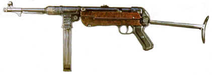 | Topo: La mitraillette MP-38 constituait le premier effort véritable de l'armée allemande pour augmenter la puissance de feu individuelle des sous-officiers allemands. Elle équipa les régiments motorisés ainsi que les formations de parachutistes de la Luftwaffe. Cette arme est construite en acier machiné et dispose d'une crosse rabattable par le bas pour réduire la dimension totale de l'arme. La poignée pistolet est en plastique et l'arme était alimentée par un chargeur détachable de 32 cartouches. En 1940, une version identique moins coûteuse fut produite: la MP-40. Elle était construite en métal estampé de l'industrie automobile et avait une cadence de tir de 650 coups/minute. Le seul handicap de ces deux armes était la munition de pistolet 9mm qui limitait la portée et la force de frappe. | ||||