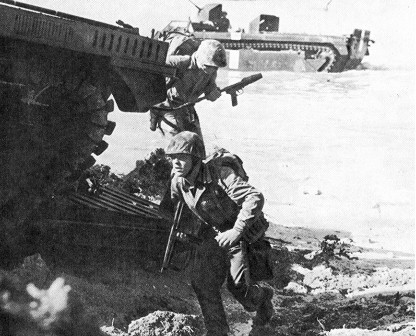 Les barges et péniches de débarquement sont mises à l'eau à 8H30 et atteignent les plages sans encombre. La scène était presque anti-climatique pour beaucoup de soldats: Où sont les Japs? A l'exception de quelques projectiles de mortiers par ci par là, il n'y avait rien à signaler sur l'arrière des plages. Celles-ci deviennent encombrées de péniches, de camions et de chars. Les Japonais avaient, évidemment, concentré leurs défenses à l'intérieur du territoire, ce qui permit aux forces américaines de débarquer sur les plages en toute impunité. Le soir du 1er Avril, 60,000 hommes avaient débarqués sur une tête de pont de 8 milles de large. Le faux débarquement simulé devant Minatoga leurra certaines unités japonaises vers le Sud-Est. Les progressions initiales sont rapides, surtout durant les deux jours suivants. Les Marines ont rejoint de nombreux civils okinawins. Peu d'entre eux se sont faits tuer car la plupart avaient fui les plages pour se réfugier dans des cavernes. Ils hésitaient à se présenter les mains en l'air car les Japonais les avaient convaincus qu'ils seraient tués par les Américains dès leur capture. Les Marines ont du les forcer à sortir de leurs réduits. Quant à l'infanterie de l'US Army, elle exploite la zone sécurisée par les Marines en poussant à l'intérieur et parvient à couper l'île en deux dès le 3 Avril. Des prisonniers de guerre sont libérés et d'autres civils okinawins se montrent pour observer ces curieux spécimen occidentaux. Ils apprennent d'eux que le gros de la force japonaise est au sud. A Tokyo, les Japonais furent consternés d'apprendre que les Marines ont capturé deux petits terrains d'aviation presque intacts.