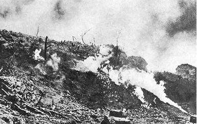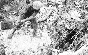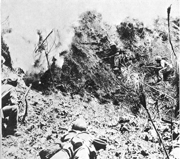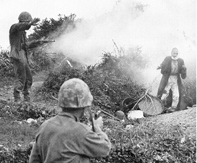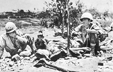 Là-encore, les chars Sherman munis de lance-flammes furent mis à contribution, de même que d'autres chars semblables munis de lames de bouteur pour enterrer vivant les irréductibles. Une erreur stratégique fut certainement commise par Spruance et Buckner: le bombardement de Naha, la capitale d'Okinawa. Il n'y avait pas de troupes japonaises dans cette ville. Le bombardement incendia la ville et plusieurs milliers de civils okinawins furent tués. Entre le 18 et le 21 Juin, les survivants valides de la 32ème Armée japonaise étaient isolés en trois poches d'encerclés ayant le dos à la mer, tout comme à Iwo Jima. Buckner envoya un appel à Ushijima pour qu'il cesse les combats, afin qu'il rende ses troupes. Ushijima reçoit le message avec une ironie amusée, ignorant qu'au même moment, l'amiral Ota s'était fait hara-kiri sur la péninsule d'Oroku. Le 18, le général Buckner fut tué par un éclat d'obus, quelques minutes après la prise de la photo ci-contre. Le général Geiger lui succéda. Les japonais d'Ushijima étaient au bout de leur rouleau après avoir résisté superbement face à un adversaire doté de moyens perçus comme inépuisables. Le dernier réduit fortifié de résistance organisée tomba le 21 Juin. Beaucoup de soldats et de civils préférèrent se suicider plutôt que de se rendre dans le déshonneur. PLusieurs groupes de soldats japonais sont enterrés vivants en scellant leurs abris avec des explosifs. D'autres se tuent en dégoupillant des grenades. Nombreux furent ceux qui se jettèrent du haut des falaises de Mabuni. Les généraux Ushijima et Cho se firent hara-kiri. Une résistance irrégulière se poursuivit jusqu'au 2 Juin, et Okinawa fut déclarée conquise et sécurisée.