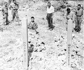 Le général Buckner est tué – Falaise de Mabuni – Prisonniers priant sur les tombes de Cho et d'Ushijima