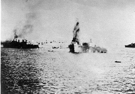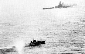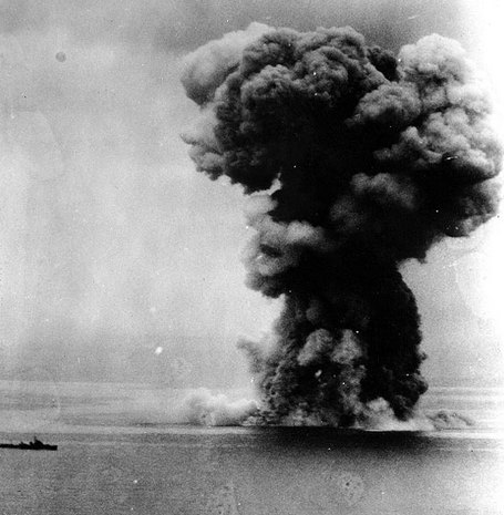 La "Force spéciale d'attaque navale" japonaise n'avait pas déduit que les adversaires du Yamato ne seraient pas des navires mais des avions. Le réseau radar naval américain l'avait détecté et a transmit les vecteurs d'interception à l'aéronavale. Mitscher ne lui donna aucune chance: 380 avions-torpilleurs et d'attaque en piqué attaquent le super-cuirassé, mais plusieurs appareils furent touchés par le tir de ses 146 canon-mitrailleurs anti-aériens, ainsi que ceux des destroyers d'escorte. Un croiseur d'escorte, le Yahagi, fut frappé par 19 bombes et 8 torpilles avant de sombrer. Le grand nombre d'appareils américain réussit à disperser l'écran de destroyers japonais et ce fut au tour du super-cuirassé d'être atteint par des torpilles: 18 torpilles firent mouche, de même que 17 bombes de 1000 lbs. L'équipage ne fut pas en mesure de contenir les voies d'eau; le navire cala de la poupe pour se cabrer, et chavirer. Peu avant de disparaître, la soute à munition explosa (ci-haut). L'Amirauté avait sacrifié inutilement son plus puissant cuirassé, bien avant que ce dernier soit en vue d'Okinawa.