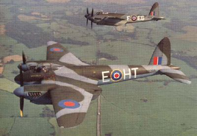Pour baliser les cibles au sol, les Britanniques organisent des escadrilles d'éclaireurs - Pathfinders - chargés de lancer des grappes de fusées de différentes couleurs autour de l'objectif, et des fusées éclairantes au-dessus de ce dernier afin de le dévoiler aux bombardiers. Cette technique avait été utilisée avec succès en 1942 et conservée par le Bomber Command en 1943. Initialement, les éclaireurs utilisaient surtout le bimoteur Wellington; mais en 1943, ils utiliseront le chasseur-bombardier Mosquito dans ce rôle. Cet avion qui fut utilisé comme chasseur de nuit à partir de l'été 1941 s'est révélé très polyvalentet moins coûteux à fabriquer unitairement que le Beaufighter tout-métal. Le Bomber Command va l'utiliser comme appareil de frappe pour faire du "ciblage" rapide en basse altitude, ainsi que de la reconnaissance photographique – atout majeur dans une offensive aérienne. Il fera des frappes sur les installations radar statiques, des dépôts de carburant, des PC de combat de la Wehrmarcht, et quelques aérodromes. Le Mosquito sera l'équivalent tactique du Me-110 allemand, mais en mieux. Il sera très redouté par la Luftwaffe (cip ci-contre). En revanche, la RAF ne dispose pas d'aucun avion de chasse monomoteur capable d'escorter ses formations de bombardiers en Europe. Bien que les Spitfire VII et IX ont prouvé leur supériorité sur des adversaires allemands de même gabarit, ils n'ont pas l'autonomie requise pour escorter les bombardiers en Allemagne. Seuls les Mosquitos en version de chasseur de nuit peuvent faire ce travail; mais le Fighter Command les gardent en Angleterre comme outil défensif.