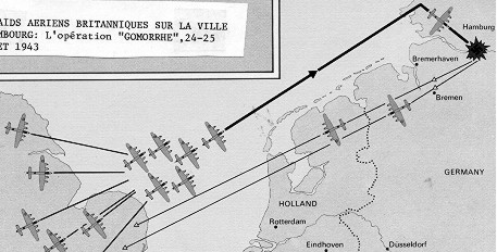 Le bombardement de Hambourg fut la première opération concertée anglo-américaine à être menée contre une ville allemande. Nom de code: Ghomorre... Il n'y a que les Brits pour avoir l'esprit aussi tordu pour donner un nom pareil à un assaut massif contre une population civile. Hambourg est la deuxième plus grande ville d'Allemagne; elle est au cœur d'un vaste réseau de communications routier, aérien, ferroviaire et maritime. Elle abrite les principaux chantiers aéroportuaires allemands, dont ceux de la célèbre firme Blohm & Voss – qui a lancé le Bismarck, le Tirpitz, ainsi que de nombreux submersibles. Hambourg est un quartier-général régional pour la Kriegsmarine et la Luftwaffe. La ville avait déjà été attaquée 98 fois des airs depuis Septembre 1939, et elle possédait un imposant dispositif de défense anti-aérien chapeauté par 20 sites Himmelbelt reliés à la Ligne Kammhuber. Ces sites géraient plusieurs escadrilles de chasseurs de nuit bimoteurs. Cependant, la Luftwaffe avait jugé que les défenses Himmelbelt étaient insuffisantes, et avait accepté l'ajout d'escadrilles de chasseurs monomoteurs pour la chasse de nuit, dans le cadre de la tactique dite Truie sauvage. La ville était également entourée de gros générateurs d'écrans de fumée – tout comme à Brême – ainsi que d'une cinquantaine de batteries de Flak contrôlées par radar. our mener la mission sur Hambourg, le Bomber Command utilise pour la première fois le leurre Window dans une tentative de déjouer les radars allemands sans que les avions soient obligés de voler à trop basse altitude. Harris ne voulait pas essayer ce gadjet plus tôt; mais il avait tellement perdu d'avions qu'il était désormais disposé à tenter cette expérience – surtout qu'il était bousculé par Churchill qui lui dit: let us open the window. La mission aura un volet multiple: les Britanniques débuteront les raids de nuit; et ils se poursuivront de jour par l'USAAF, avant d'être relayée de nuit par le Bomber Command. Harris ne voulait pas donner de répit aux défenseurs allemands et maximaliser ses chances de dévaster la plus grande superficie possible de la ville. L'opération est appelée Gomohrre – en prévision de l'apocalypse anticipé.