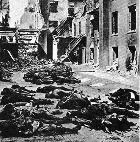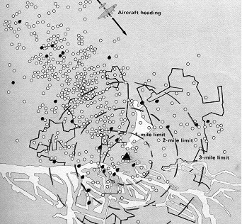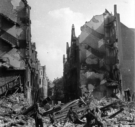 Les autres quartiers visés n'étaient plus que des pans d'immeubles en flammes (ci-contre). Le succès du Bomber Command durant cette première nuit se confirma par le peu de pertes: 12 bombardiers abattus. Quant aux autres, 306 des 731 appareils de la mission ont réussi à larguer leurs bombes dans un cercle inférieur à 3 milles du point d'impact établi (voir carte ci-haut). Dans cette même journée, la 8th Air Force de Doolittle envoya 235 B-17 pour déverser un autre lot d'incendiaires sur Hambourg – ce qui épuisa les efforts des pompiers et secours allemands. Le 26, le Bomber Command remet ça dans la nuit avec 699 appareils; le jour, l'USAAF revient avec 210 appareils pour attiser les incendies.. .Le 27, le Bomber Command fit un autre gros raid: 787 appareils naviguèrent vers la ville par une route différente de celle du 24, afin de tromper la défense allemande; 325 bombardiers larguèrent leurs bombes à moins de 3 milles du point de visée. Une bonne partie de ces munitions consistait en des bombes de 250 et 500 livres dont l'effet brisant cassait les immeubles.