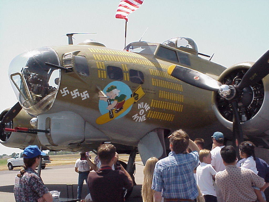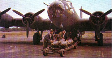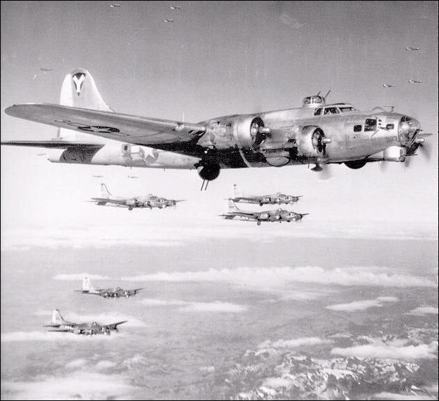 Quatre types de bombardiers ont été utilisés par l'USAAF durant les bombardements stratégiques en Europe. Mais aucun d'entre eux ne s'est gagné une notoriété aussi importante que le quadrimoteur Boeing B-17. Le plafond maximal de cet appareil était de 35,000 pieds. Cependant, l'altitude de croisière était de 22,000 pieds; quoique plusieurs missions ont été menées à des altitudes plus basses, ce qui faisait rager les aviateurs. Le handicap majeur de ce bombardier était son absence de chauffage, et les engelures furent les principales causes de blessures au combat: les aviateurs américains gelaient dans ces carlingues. Malgré qu'il soit lent, les équipages qui revenaient de mission vénéraient la résistance de l'appareil, lorsque celui-ci était percé durant les combats. Plusieurs équipages allaient même jusqu'à leur donner des noms de femme (Lulu Belle, My Zita, Memphis Belle, etc). La personnalisation de la décoration d'un B-17 était même permise, surtout pour maintenir le moral des équipages: on parlait alors de "nose art", et elle fut pratiquée sur de nombreux types d'appareils américains, dont les Boeing B-17 (ci-haut). Comme tous les quadrimoteurs alliés de la guerre, le B-17 restait un avion étroit à l'intérieur duquel il n'était pas facile de se déplacer. La division du travail à bord d'un B-17 ressemble à celle des autres appareils de même gabarit, comme le Lancaster britannique: Le pilote = celui qui manoeuvre l'appareil, qui prend les décisions à bord et qui gère tout car il est le seul, selon lui, à posséder le right stuff. Tous les équipiers lui acheminent l'information pour fins d'approbation. Lors d'une sortie, il doit maintenir son appareil à l'altitude prescite par le responsable du raid de bombardement. Le pilote est assis sur le côté gauche du cockpit. Le co-pilote = est le navigateur qui a pour fonction d'aider le pilote à manoeuver son appareil tout en étant en charge de certaines commandes de vol. Comme il a lui-aussi une formation de pilote, il peut au besoin remplacer un pilote blessé ou tué et ramener l'appareil à sa base. Le navigateur a aussi la fonction de tenir le journal de bord, tout en manipulant les deux mitrailleuses frontales.