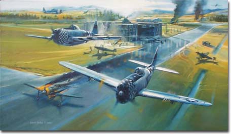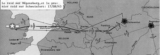 Tout devait être entrepris pour disperser les formations serrées d'avions américains, en attaquant par le haut et par le bas. Galland insista toujours sur le point suivant: tout faire pour abattre l'avion de tête, car c'est lui qui porte le viseur Norden et qui donne le signal aux autres de larguer leurs bombes. La mission américaine débute le 17 Août, par le décollage des deux premières vagues chargées de faire des attaques de diversion. Une escadrille de nouveaux chasseurs-bombardiers P-47 munis d'un réservoir auxiliaire larguble frappe l'aérodrome d'Arras et détruit plusieurs chasseurs FW-190 au sol, de même que certains autres au décollage (peinture ci-contre). De surcroit, 39 autres chasseurs allemands sont dispersés. Mais une mission de combat ne se déroule jamais comme prévu – c'est-à-dire selon le plan pré-établi; car, il y a toujours des facteurs impondérables qui gênent les attaquants et les obligent à faire de leur mieux avec leurs moyens dans la conjoncture qui leur est imposée. La deuxième formation de diversion vole en rase-mottes pour économiser l'essence, mais elle est gênée par le mauvais temps brumeux qui sévit sur l'Europe du Nord-Ouest. Elle ne pouvait pas être escortée par les P-47 en Allemagne. Néanmoins, elle réussit à larguer ses bombes au-dessus de l'usine Messerschmitt de Régensburg à midi. Tel qu'anticipé par les planificateurs de la mission, la Luftwaffe intercepte les 147 quadrimoteurs et en abat 27. Les autres larguent leurs bombes sur leurs cibles et fuient vers l'Afrique du Nord. So far so good…