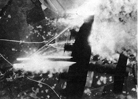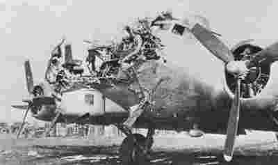 Cependant, ce complexe industriel fut remis en état de fonctionner, mais son taux mensuel de production a été réduit de 30%. Un second raid sera tenté en Octobre, mais il connaitra un échec aussi cuisant: 60 quadrimoteurs et bimoteurs américains seront abattus et une centaine lourdement endommagés. Les escadrilles allemandes n'ont aucune difficulté, là encore, à disperser les formations de B-17 et et les abattre (ci-bas à droite). Les pilotes allemands qui font leur boulot sous le feu des mitrailleuses américaines ne sont pas des "monstres" mais des héros aux yeux de leurs concitoyens éprouvés par les bombardements. Leur réputation est vénérée en Allemagne au même titre que celle des pilotes de chasse britanniques durant la bataille d'Angleterre. De nombreux aviateurs américains doivent leur vie à la solidité du fuselage du B-17; car bon nombre de ces appareils ont pu revenir se poser en Angleterre malgré des dégâts importants (image ci-bas). Le général Galland qualifia la mission américaine de désastre important pour l'ennemi. Il avait raison, car la capacité opérationnelle de la 8th Air Force fut très affaiblie – beaucoup de pilotes devinrent amers et ne pensèrent qu'à compléter leurs 25 missions et de "rentrer chez eux". Qui plus est, les Allemands purent s'approvisionner en lingots métalliques via la Suède et la Suisse, grâce aux efforts du ministre Speer et de ses principaux subordonnés. Speer entreprit de décentraliser la production de guerre allemande pour la rendre moins vulnérable aux tapissages alliés. Les raids sur Schweinfurt ont eu un impact désapprobateur dans la presse américaine. L'opinion publique fut choquée par le taux de pertes sans grand résultat apparent. Mais Eaker et Doolittle demeuraient déterminés à poursuivre leurs opérations de bombardements diurnes, malgré les succès de la défense aérienne allemande – ci-contre à gauche, un tir anti-aérien fait perdre un moteur à ce B-26.