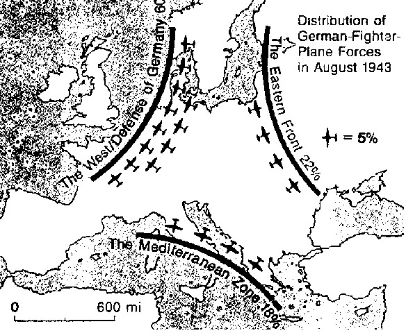 La validité militaire des bombardements stratégiques restait toujours à prouver. Les usines allemandes – de plus en plus décentralisées et cachées sous terre – continuaient toujours d'approvisionner les forces armées qui combattaient en URSS et en Italie. Le moral de la population ne fut pas trop atteint – pas assez pour contester la légitimité du régime nazi. Ils ont, sans doute, encouragé un certain courant de desillusion et de conspiration au sein de la Wehrmarcht; mais, il n'était pas suffisamment organisé pour nuire aux nazis. La véritable contribution des bombardements stratégiques fut non pas de ruiner l'Allemagne, mais d'obliger la Luftwaffe à retirer de nombreuses escadrille de chasse des fronts russes et méditéranéens pour les transférer en Allemagne – privant ainsi de nombreuses unités d'une couverture aérienne indispensable à la bonne marche de leurs opérations défensives.