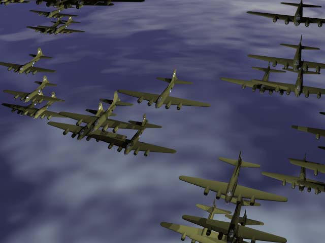 La 8ème USAAF naviguait un formations serrées comprenant plusieurs "carrés de combat" (combat boxes). Trois appareils formaient un premier triangle - un appareil de tête et deux légèrement en survol sur son arrière; trois groupes de triangle - un de tête et deux légèrement en survol sur son arrière – formaient une "aile"; trois ailes formaient une "combat box" (ci-haut) qui devait voler en formation serrée. L'avantage de la formation serrée, tel que perçu par l'USAAF permettait à la fois de la protéger par un rideau de feu venant des tirs de mitrailleuses. Le B-17 pouvait porter jusqu'à 12 mitrailleuses – d'où son surnom de "Forteresse volante". L'autre avantage était celui de pouvoir larguer des grappes de bombes en paquets serrés, et espérer ainsi détruire plus efficacement la cible visée. Lorsqu'il veut bombarder, il doit s'efforcer de ralentir son appareil à 110 mph afin de permettre au navigateur-bombardier d'utiliser son viseur. Les équipages de quadrimoteurs américains étaient dirigés en vol par un commandant de mission, dont la fonction était de préserver l'intégrité de la formation serrée et de la faire naviguer au-dessus de l'objectif. Ce commandant était dans l'avion qui faisait partie du triangle de tête. Le navigateur-bombardier de l'appareil de tête avait une énorme responsabilité: déterminer le lieu de larguage des bombes de toute la formation. A son signal, il déversait son stock de bombes, geste aussitôt imité par les autres bombardiers. Une fois délestés, les quadrimoteurs devaient retourner le plus rapidement possible à leurs bases en Angleterre – personne ne se faisait prier pour rester au-dessus de la zone de combat une fois les bombes larguées.