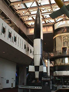 | Topo: Le prototype A4 mis au point par l'équipe de Von Braun et de Thiel fut adopté comme arme offensive en 1944. Les premières tombèrent sur la Hollande en Septembre 1944, et les autres sur Londres. Le V-2 étant supersonique, il n'y avait aucune défense contre ce type d'arme. Il est l'ancêtre fonctionnel du missile balistique sol-sol d'aujourd'hui. Une variante avec ailes en flèche fut lancée à l'automne 1943. Il pouvait être lancé à partir de rampes fixes ou mobiles. Il était guidé initialement par radio, puis par l'inertie d'un gyroscope de combat. | |||