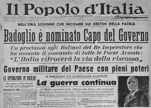 Un coup d'État légal renverse le Parti fasciste, et instaure une monarchie constitutionnelle dirigée par le maréchal Badoglio. Ce dernier entreprend des pourparlers avec les Alliés. Le 9 Septembre, Badoglio envoie le général Castellano pour signer la capitulation de l'Italie devant les généraux américains Bedell-Smith et Eisenhower, et le diplomate Macmillan (ci-contre). La population italienne est informée par le discours radiophonique d'Eisenhower et croit que la paix est à portée de mains. Cependant, tout va aller de travers pour le nouveau gouvernement italien. Lorsque le roi Victor-Emmanuel III choisit Badoglio pour succéder à Mussolini, il n'a certes pas choisi le meilleur homme. Badoglio est âgé et n'a aucune expérience politique. Il était le commandant en chef de l'armée italienne de l'entre-deux guerres, mais il n'a plus l'énergie ni la fermeté nécessaire pour reprendre en main une Italie épuisée par trois années de guerre. Badoglio ne recevra aucune directive claire sur ce qu'il doit faire pour contribuer à l'effort de guerre allié. Son conservatisme ne fera pas consensus au sein de la classe politique italienne. Badoglio a ressuscité le multipartisme qui avait été muselé par vingt ans de fascisme – ce qui aura comme effet pervers d'affaiblir la société italienne déjà meurtrie par la guerre. Qui plus est, son gouvernement n'aura pas le temps nécessaire pour organiser les bases d'un nouveau régime pro-allié, car les Allemands ne restent pas indifférents.